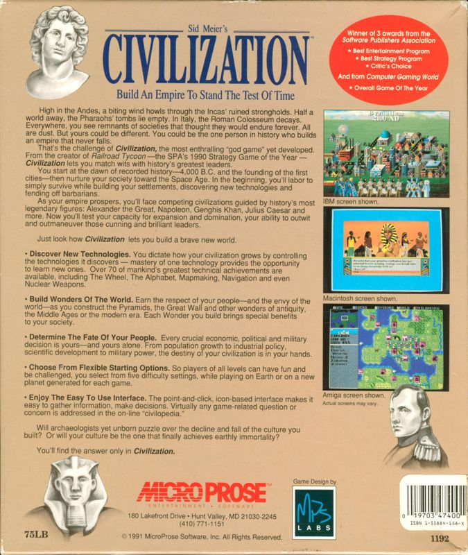 Civilizace byla ve své době ohromným úspěchem, protože roku 1991 tady zdaleka nic tak strategicky propracovaného nebylo. Grafika, alespoň na základní herní obrazovce, byla poměrně jednoduchá. Podobná jako ve hře Sim City. Oproti ní má však spoustu pěkně zpracovaných obrazovek, například při budování města, nebo při různých událostech. Windows verze vyšla o dva roky později a přinášela informační okna a barevnější a trochu ostřejší grafiku. Tady na Smetišti her k dispozici původní DOS verze z roku 1991.