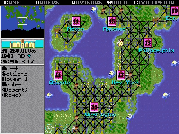 Civilizace je tahová strategická hra pro jednoho hráče. Hra obsahuje civilizace Američanů, Aztéků, Babyloňanů, Angličanů, Egypťanů, Francouzů, Němců, Řeků, Číňanů, Indů, Mongolů, Římanů, Rusů a Zulů. Uf, to je poměrně bohatá nabídka národů, i když se jedná spíše o kosmetickou volbu. Hra začíná v roce 4000 př.n.l. a může trvat až do roku 2100 našeho letopočtu. Na počátku nejsou na světě žádné města a hráč ovládá jednotku osadníků, kterou lze použít k zakládání nových měst. Osadníci mohou také upravovat terén, stavět vylepšení, silnice, anebo železnice. Civilizace obsahuje značné množství mikromanagementu. Směřování vaší civilizace lze shrnout do tří kategorií – průzkum, válčení a diplomacie. Hráč se také musí rozhodovat kde postavit nové města, jaké vylepšení vyzkoumat, jaké jednotky v každém městě získat. Čas od času vás může napadnout jednotka bez konkrétní národnosti – barbar.